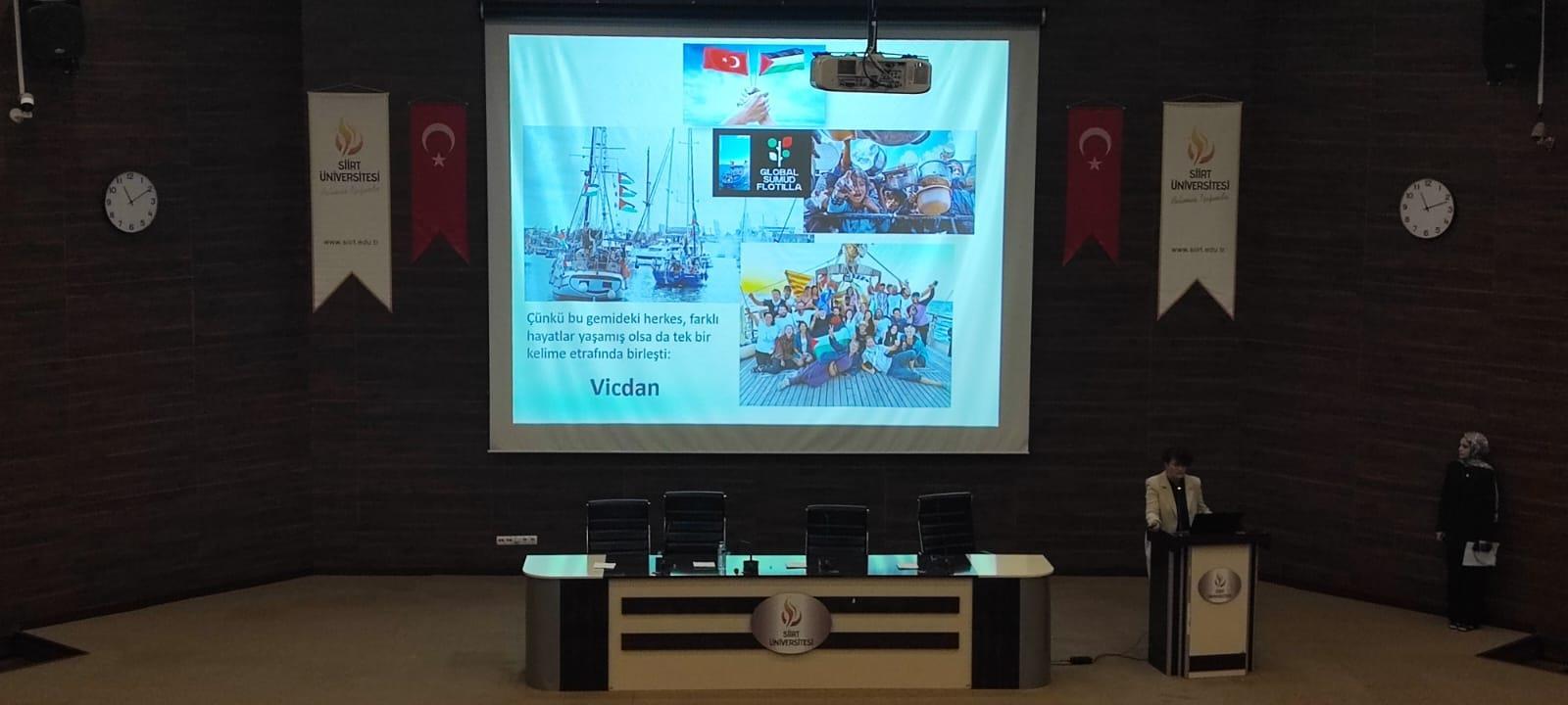 Bu vicdan çağrısının somut bir örneği olarak Sumud Filosu gösterildi. Farklı kıtalardan, inançlardan ve ideolojilerden gelen insanların, pasaport, bayrak ve ideoloji gibi hiçbir ayrım gözetmeksizin tek bir kelime — “Vicdan” — etrafında birleştiği vurgulandı. Filonun, “insanlık kavramının hâlâ var olduğunu kanıtlayan yaşayan bir fotoğraf” olduğu ifade edilerek, mühendislik öğrencilerine hem teknik hem de insani sorumluluklarını unutmamaları yönünde güçlü bir mesaj verildi.